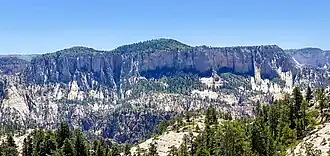 Greatheart Mesa is located 8.5 miles (13.7 km) north of Springdale, Utah, in Zion National Park. The mesa is composed of white Navajo Sandstone with a ponderosa pine forest covering the top. The landform's toponym was officially adopted in 1935 by the U.S. Board on Geographic Names.[3] It was so named after the heroic character named "Greatheart" in the novel The Pilgrim's Progress,[4] and because this white-walled mesa would require a person with a stout, great heart to climb it.[5] Precipitation runoff from this mountain drains into North Creek which is a tributary of the Virgin River.