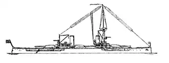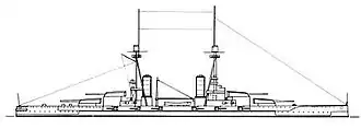 The initial design called for a ship 458 ft (140 m) long with a beam of 72 ft (22 m), a draft of 24 ft (7.3 m), and a displacement of 13,500 long tons (13,700 t). The ship was designed with 2-shaft turbines rated at 26,000 shp for a top speed of 21 knots (39 km/h; 24 mph). The armament was to be six 14-inch (356 mm) guns in twin turrets all on the centerline with one amidships, eight 6 in (152 mm), eight 3 in (76 mm), and four 37 mm (1.5 in) guns, and two 45 cm (18 in) torpedo tubes.[16]