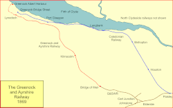 The G&SWR offered the possibility of a new direct rail connection to a new harbour and pier to the north-west of the town, which the Burgh was then constructing. This was a prodigious scheme for both parties, involving lengthy tunnelling for the railway. The excavation and construction of the Albert Harbour facilities cost £250,000. Prince's Pier cost around further £100,000.[2] The railway part of the scheme was to involve the upgrading of the Bridge of Weir line, the construction of a short line from Cart Junction (on that line) to Elderslie, and a new line from Bridge of Weir to Greenock.
