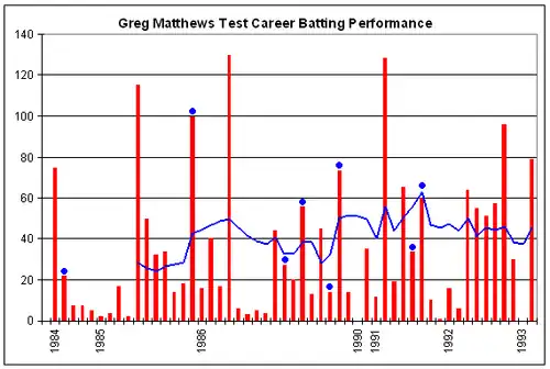 When Australian cricket was in the doldrums in the 1980s "his dashing batsmanship and growing ability as a spin bowler suddenly elevated Matthews to a position of a national hero".[3] He made centuries in times of crisis against New Zealand and India in 1985–86, took ten wickets in the Tied Test at Madras and batted well against England in 1986–87.