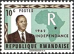 In 1961 the Rwandan monarchy was dissolved and a brief transitional administration was led by Dominique Mbonyumutwa.[1] Rwanda became independent at midnight on 1 July 1962. Kayibanda spoke at ceremonies later that day to commemorate the occasion, thanking the people who had contributed to the country's independence. He also thanked the work of the Belgians, Germans, and United Nations in developing the country. He said, "Though the Belgians made some mistakes here, the net result of their effort has been most positive," and appealed to them and other countries for technical aid.[2] He led Rwanda's first delegation to the United Nations General Assembly on 18 September.[3] Kayibanda was elected president on 26 October.[1] Over the next three years, Kayibanda increased his power step by step. By 1965, Parmehutu was the only legal party in the country. At elections held that year, Kayibanda appeared alone on the ballot for president. He was reelected in 1969, again as the only candidate. In both elections, a single list of Parmehutu candidates was returned to the legislature. The 1962 constitution of Rwanda, enacted by Kayibanda's regime, proscribed communist activities and propaganda as Belgian settlers conditioned the gain of independence to the rejection of Communism, in the era of the iron curtain. The UNAR party threatened to turn their back on the Belgians and adhere to communism.[4]