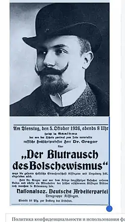 Gregor Schwartz-Bostunitsch was a radical author with German-Russian ancestry.[1] An active agitator against the Bolshevik Revolution, he fled his native Russia in 1920 and travelled widely in eastern Europe, making contact with Bulgarian Theosophists and probably with G.I. Gurdjieff.[1] As a mystical anti-communist, he developed an unshakeable belief in the Jewish-Masonic-Bolshevik world conspiracy portrayed in the Protocols of the Elders of Zion.[2] In 1922 he published his first book, Freemasonry and the Russian Revolution, and emigrated to Germany in the same year.[3] He became an enthusiastic convert to Anthroposophy in 1923, but by 1929 he had repudiated it as yet another agent of the conspiracy.[3] Meanwhile, he had begun to give lectures for the Ariosophical Society[4] and was a contributor to Georg Lomer's originally Theosophical (and later, neopagan) periodical entitled Asgard: a fighting sheet for the gods of the homeland.[5] He also worked for Alfred Rosenberg's news agency during the 1920s before joining the SS.[3] He lectured widely on conspiracy theories and was appointed an honorary SS professor in 1942, but was barred from lecturing in uniform because of his unorthodox views.[3] In 1944 he was promoted to SS-Standartenführer on Himmler's recommendation.[3]
