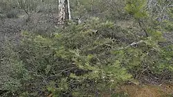 • Grevillea hookeriana subsp. digitata (F.Muell.) Makinson[11] is a spreading shrub up to 2 m (6 ft 7 in) tall with narrowly wedge-shaped leaves 10–20 mm (0.39–0.79 in) long with five to nine teeth 3–6 mm (0.12–0.24 in) long and 1.2–1.6 mm (0.047–0.063 in) wide, the flowers usually yellowish-green to greyish-fawn with a purplish-black or dark maroon style with a green tip, flowering in most months with a peak from August to November;[12][13]