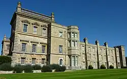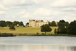 Grimsthorpe Castle is a country house in Lincolnshire, England 4 miles (6.4 km) north-west of Bourne on the A151. It lies within a 3,000 acre (12 km2) park of rolling pastures, lakes, and woodland landscaped by Capability Brown. While Grimsthorpe is not a castle in the strict sense of the word, its character is massive and martial – the towers and outlying pavilions recalling the bastions of a great fortress in classical dress. Grimsthorpe has been the home of the de Eresby family since 1516. The present occupant is Jane Heathcote-Drummond-Willoughby, 28th Baroness Willoughby de Eresby, granddaughter of Nancy Astor, who died at Grimsthorpe in 1964.[1]
