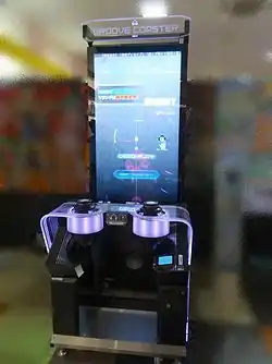 The Groove Coaster arcade version (known as Rhythmvaders in some areas outside Japan) was released on November 5, 2013, with the touchscreen replaced by two giant controllers called "BOOSTERs" with a white button on each.