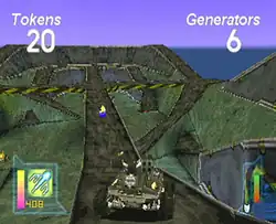 Grudge Warriors places the player in control of one of eleven special armored cars.[3] Each one is equipped with five types of weaponry. Four of the weapons are similar on all the cars; the fifth weapon is unique to the vehicle.[4] In single-player, the objective for each mission is to destroy enemy tanks, gun emplacements, vehicles, and generators; there are always eight at each base which must be destroyed.[5] In addition, players can collect tokens as an optional objective; these tokens allow for upgrades and boost the player's score. Some generators can only be reached by solving puzzles; for example, toggling switches which lower otherwise-impenetrable shields surrounding a generator.[5] Every player vehicle features both armor and health; powerups which replenish both can be found scattered throughout the maps. In addition, the player has only a finite amount of ammunition for each weapon. When the player's health is reduced to zero, the game is over and the mission must be restarted.