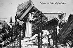 Public buildings, schools, churches, the theater, museums were all in the hopeless state of desolation in which they were left by the earthquake. Bits of roof hanged down the outsides of the walls and the footway was littered with heaps of stucco ornaments and shattered cornices. A payment of some hundred dollars would secure that a house that had been marked as unsecure with a black cross was then dimmed as done with its necessary repairs, allowing the owners to leave the houses empty and in ruins.[12] But it was at the cemetery that the utter devastation was most evident: all was demolished on the night of the earthquake and it was said that something like eight thousand dead were literally shaken from their graves, threatening pestilence to the city and forcing the authorities to burn all of them in a gigantic bonfire.[12] The dark cavities of the empty tombs were still opened in 1920 and no attempt had been made to restore the cemetery to its original condition.[12] The tomb guarded by the Augustine monk mentioned by Salazar in 1896 was completely destroyed and by its unique characteristics was pictured in 1918 to illustrate the effects the earthquake had on the cemetery.