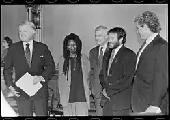 Goldberg became intrinsically linked to Star Trek, and she became a personal friend of creator Gene Roddenberry, subsequently being one of the eulogists at his funeral in 1991.[14] During the initial production of Star Trek VI: The Undiscovered Country, she met with director Nicholas Meyer to discuss appearing as a Klingon in the film. This was vetoed by actor Leonard Nimoy,[15] who had taken the lead on arrangements for the film,[16] as with Christian Slater already set to appear in the film he did not want to be overwhelmed with celebrity cameos.[15] She later described Guinan as a combination of Yoda, herself and Andrei Sakharov, adding that she was "more grateful for Star Trek now as a mother and grandmother" and described the prospect of Star Trek, saying "We all need to believe there is a good, positive future for us."[17]