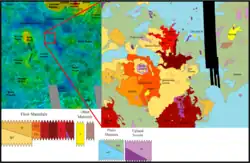 Volcanism is one of the fundamental processes of heat transfer from planetary interiors.[8] By assessing the location of volcanic deposits and edifices, their volumes, and their sequences provide evidence for quantitative assessment of heat transfer in space and time. The region contains three major volcanoes which have smaller volcanic constructs built upon their flanks and summit regions: Atanua, Rhpisunt, Tuli, and Var Mons, and three coronae: Hulda, Madderakka, and Pölöznitsa. Due to the amount of flows from these major eruptive centers, there is much obscurities among the deposits. Relative age relationships both within and between the major eruptive centers are difficult to determine due to the complex nature in which these flows coalesce and inter-finger. Each volcano appears to have had an extensive period of eruptive activity with several major phases creating large flow fields and more localized activity occurring both at vents on the flanks of the volcanoes and at their summits. Geologic mapping shows a general progression from upland terrain to volcanic plains and then to shield volcanoes and flow fields but also reveals a complex interplay between volcanic and tectonic processes.[9]