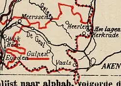 The electoral district of Gulpen was created in 1888 out of part of the Maastricht district, which was reduced from two seats to one. Gulpen's boundaries remained the same throughout the electoral district's existence. It was situated in the south of the province of Limburg, including places such as Heerlen, Kerkrade and Vaals, as well as the village of Gulpen, after which it was named. Containing much of the South Limburg coal mining basin, mining was the most important economic activity in the district.[1][2]