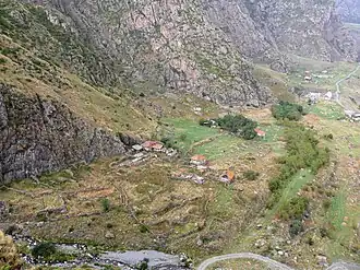 Gveleti[a] (Georgian: გველეთი; Ingush: Гелате, romanized: Gelatĕ) is a village (aul) in the Kazbegi Municipality of Georgia. It is located in the Darial Gorge, on the right bank of the Devdaraki (a left tributary of the Terek river), 4 km from the border with Russia. Gelatĕ was founded by the Ingush clan (teip) Gelatkhoy (Ingush: Гелатхой).