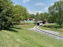 The park also features an L-shaped Olympic-size swimming pool, with a "double pool slide." Admission to the pool is three dollars (children 3 and under are admitted free). A multiple-visit pass is also available (20 visits for fifty dollars).[12]