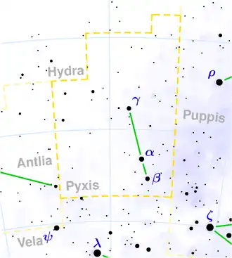 | CD−26°6647, CPD−26°3737, Gaia DR2 5649246148871668224, GC 12478, HD 77361, HIP 44290, HR 3597, SAO 176833, PPM 255522, TIC 37569580, TYC 6593-2444-1, GSC 06593-02444, IRAS 08590-2627, 2MASS J09011142-2639493[10] | |