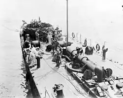 In 1915 Rattlesnake participated in the naval operations in the Dardanelles Campaign. Notable was an action supporting the Australian First Division on 27 May at Kabatepe. Turning the ship's searchlight onto the coast, the crew identified the Ottoman Army trenches and opened fire. A large communications line was destroyed, enabling the troops to advance.[33] The destroyer returned to the same location during the evening of 18 December and, once again using a combination of a searchlight and guns, supported the evacuation of the same division.[34] The next year saw Rattlesnake still a member of the Fifth Destroyer Flotilla within the Mediterranean Fleet.[35] Submarine action by the Imperial German Navy in the Mediterranean Sea was intensifying, with a commensurate impact on British shipping. In February alone, fifty ships, totalling 101,000 long tons (103,000 t), were lost. Due to a lack of resources, the destroyers in the Mediterranean Fleet could only escort high value ships, like troopships.[36]