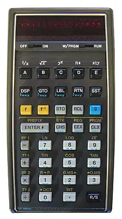 The HP-65 is the first magnetic card-programmable handheld calculator. Introduced by Hewlett-Packard in 1974 at an MSRP of $795[1] (equivalent to $5,069 in 2024)[2], it featured nine storage registers and room for 100 keystroke instructions. It also included a magnetic card reader/writer to save and load programs. Like all Hewlett-Packard calculators of the era and most since, the HP-65 used reverse Polish notation (RPN) and a four-level automatic operand stack.