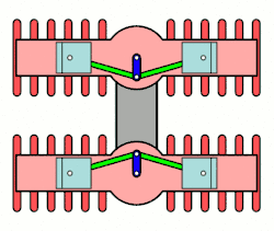 German firm Konig, who specialised in racing outboard motors,[6] built a few 1000cc H-8s in the 1970s, which were basically two of their VC500 flat fours mounted one above the other, with the direction of rotation reversed on one of them. Each half of the engine was a water cooled 2-stroke with rotating disc valve driven by a toothed belt via two 45/90 degree pulleys, plus two siamesed expansion chamber exhausts, fed by two single choke carbs. Both cylinders at each end of each engine fired at the same time, hence the siamesed exhausts for each pair.