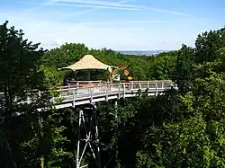 A traditional trail is Rennstieg. It is 19,5 mls (31,3 km) long and leads from Eigenrieden in the north to Behringen in the south across Hainich. On 26 August 2005 nearby Thiemsburg forester's house in the southeast of Hainich one of the largest tree canopy paths was declared to be open. It is the most important institution for environmental education in Thuringia and a platform for ecological research in the treetop region of a broadleaf forest. An attraction in Mühlhäuser Stadtwald are the Redwood trees (Sequoiadendron giganteum) from 1884. They are the largest ones in Thuringia. A trail from Weißes Haus on the eastern edge of Hainich leads to this site. Another curious tree, also in Mühlhäuser Stadtwald, is Corpusbuche a 400-year-old hornbeam.