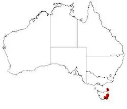 This species is found on the east coast of Tasmania and the Furneaux group of islands. Growing at lower altitudes in coastal areas, river bushland or drier forest. On the islands it grows at higher altitudes with longer leaves and perianth and larger fruit.[2]