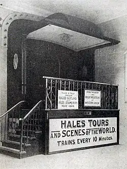 The first appearance of Hale's Tours were at the 1904 St. Louis Exhibition. The idea was further refined under the name Pleasure Railway. The idea then appeared in New York and Chicago and spread throughout the United States and Canada with an estimated 500 Hale's Tours appearing between 1906 and 1911.[2] In 1906 Wade C. Gifford took Hale's Tours throughout the world in Mexico, the British Isles, Continental Europe and Hong Kong.