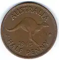 The reverse during this time consisted of the words "ONE HALF PENNY" in three lines at the centre, surrounded by a beaded circle. A small scroll is located under the word "PENNY" within the beaded circle, and the legend "COMMONWEALTH OF AUSTRALIA" with the issued date surrounding the circle of beads.[7] Depending on the place of mintage, certain coins could also contain a small mintmark located under the scroll.