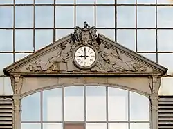 The stone base structure was originally used for the storage and sale of grain and flour. The glass and metal pavilion housing the main market hall is of a modular design, with 80 pillars forming the perimeter and a further 20 interior pillars supporting the roof.[4] It has a church-like structure, with a large central "nave" flanked by two smaller side aisles.[1][4] The roof is fitted with a skylight to allow natural light to enter and its height of 12 metres was chosen to avoid a build up of humidity inside.[1][7] The main entrance to the market hall is adorned with additional columns and a pediment featuring a clock and reliefs of Mercury, the Roman god of commerce, and Ceres, the goddess of agriculture.[1][7] Covered walkways flanking the longer sides of the pavilion were added in the late 1920s,[nb 1] and the building was electrified in 1950.[2] The market complex was inscribed (a level of protection granted to buildings and objects of regional importance) to the list of historic monuments on 14 May 1987.[1]