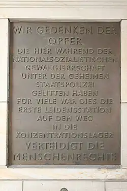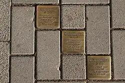 The former Gestapo headquarters at Stadthausbrücke 8 was used by the Hamburg Building Authority, among others, after the end of the war. Until 1980, there was no evidence of the building's use under National Socialism. In 1980, employees of the building authority appealed for donations and published the brochure "Dokumentation Stadthaus in Hamburg. Gestapo Headquarters from 1933 to 1943" to place a memorial plaque for the victims of the Gestapo at the main entrance to the building.[77] This suggestion was implemented in 1984.[78] In 2008 and 2009, three stumbling stones were laid in front of the main entrance to the Department for Urban Development and the Environment at Stadthausbrücke 8 in memory of three men who died in the Gestapo headquarters.[79]