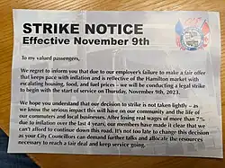 - ^ Freeman, Joshua (November 9, 2023). "Hamilton transit workers hit the picket lines as strike gets underway". CP24. Bell Media. Retrieved January 12, 2024.