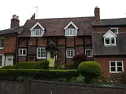 There are some well preserved 17th century and timber-framed houses, some of which are listed.[7] Outside the village, to the south-east, is the 15th-century packhorse bridge over the River Blythe and on the former route to Kenilworth.[1] Only 5 ft (1.5 m). wide between the low parapets, consisting of five bays with ancient stone piers having pointed cut-water faces on the west side against the flow of the stream—and square projections on the east. The three northern arches are segmental-pointed, the southern two have been rebuilt with brick arches. East of the bridge is a ford.[7]