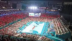 The Stade Pierre-Mauroy stadium in Lille can be changed from a football stadium to a handball stadium in three hours by moving the center part with hydraulics lifts and slide them above the other part of the field. This creates a lower-level center floor around which up to 30,000 seats can be set up. The handball court is turned 90° compared to the football pitch.