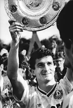 ![]() Pilz lifting the East German Championship trophy in 1990 | |||