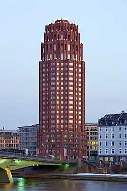 In Berlin, he has designed in Potsdamer Platz a high-rise tower in an old-New York brick style, for DaimlerChrysler. He was also responsible for the master planning of high-rise buildings on the Alexanderplatz.[6] Among his works are also the reconstruction of the former Reichsbank into the new Foreign Office, and the so-called Leibnizkolonnaden in the district of Charlottenburg-Wilmersdorf near the Kurfürstendamm. In 2005 he constructed the inner rooms of the exclusive night club Goya on Nollendorfplatz, that opened on December 1 in the building where the Metropol had formerly been. In Frankfurt am Main he has erected the 88-meter-tall (289 ft) residential building Main Plaza in the Deutschherrnviertel. At Alte Messe Leipzig, he designed in 1996 one of the nine head offices of the German Central Bank.[7] which was in 1999 awarded the Architekturpreis der Stadt Leipzig (Architecture Award of the City of Leipzig).[8]