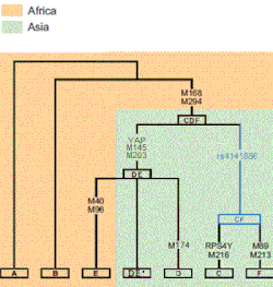 - ^ Haber, Marc; Jones, Abigail L; Connell, Bruce A; Arciero, Elena; Yang, Huanming; Thomas, Mark G; Xue, Yali; Tyler-Smith, Chris (2019). "A Rare Deep-Rooting D0 African Y-Chromosomal Haplogroup and Its Implications for the Expansion of Modern Humans Out of Africa". Genetics. 212 (4): 1421–1428. doi:10.1534/genetics.119.302368. PMC 6707464. PMID 31196864.