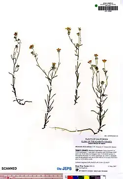 This plant was first described in science in 1985, when it was named Madia doris-nilesiae after the California botanist and teacher Doris Niles.[1][2] It and several others were moved to the new genus Harmonia in 1999.