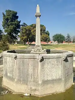 Harriet Quimby died at age 37 and was buried in the Woodlawn Cemetery in The Bronx, New York.[24] The following year her remains were moved to the Kensico Cemetery in Valhalla, New York.[25] A cenotaph to Quimby, the Harriet Quimby Compass Rose Fountain, was erected at Pierce Brothers/Valhalla Memorial Park Cemetery in Burbank, California. Located close to the cemetery's Portal of the Folded Wings, a shrine containing the ashes of aviation pioneers, the Quimby fountain's plaque reads: