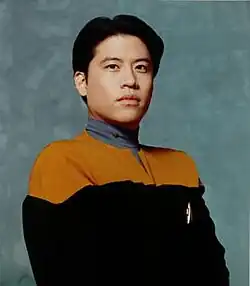 The character went through more than one name prior to casting, with it being called Jay Osaka at one point.[2] The series bible for Star Trek: Voyager described Kim as being a sheltered individual who had sought to repay the love of his parents through fulfilling their expectations for him at Starfleet Academy.[1][3] Winrich Kolbe, the director of the Voyager pilot "Caretaker", was involved in the casting process and found Kim difficult as there was not a great number of young Asian actors to choose from.[4] He said that the role was an "inexperienced, naive character", and that the actor cast as Kim would need to fight to stay in the forefront of episodes.[4]