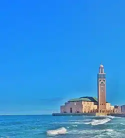 The Hassan II Mosque (Arabic: مسجد الحسن الثاني) is a mosque in Casablanca, Morocco. It is the second largest functioning mosque in Africa and is the 14th largest in the world. Its minaret is the world's second tallest minaret at 210 metres (689 ft).[2][3] Completed in 1993, it was designed by Michel Pinseau under the guidance of King Hassan II and built by Moroccan artisans from all over the kingdom. The minaret is 60 stories high topped by a laser, the light from which is directed towards Mecca.[4] The mosque stands on a promontory looking out to the Atlantic Ocean; worshippers can pray over the sea but there is no glass floor looking into the sea. The walls are of hand-crafted marble and the roof is retractable. A maximum of 105,000 worshippers can gather together for prayer: 25,000 inside the mosque hall and another 80,000 on the mosque's outside ground.[3]