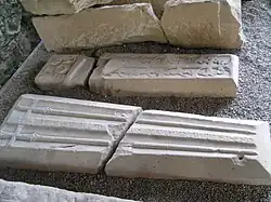 The Haughmond Abbey buildings, like those at Lillsehall, show signs of Cistercian architectural influence.[56] The standing remains are of white sandstone rubble construction with ashlar dressings. At the highest points, floors and lower walls were made by shaping the red sandstone that underlies the site.[97] Most of the buildings were grouped around two cloisters. They include: the foundations and west cloister doorway of the late 12th- and early 14th-century church; the late 12th-century chapter house (which is still roofed); the west wall of the warming house and dorter; the walls of the frater and its undercroft; and the early 13th century infirmary, flanked by the abbot's lodging to the east. Apart from a few walls, little else has survived from the western side of the site and, at the northern edge, the abbey church has completely disappeared – although the cruciform ground plan is still clearly visible.