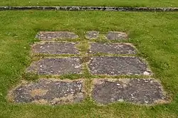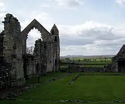 The abbey site would have been enclosed by a perimeter ditch but this is no longer apparent. The precinct is still partly enclosed by a wall of undressed stone, around the south and west sides. The entrance to the abbey was about 130 metres north of the church, where the gatehouse has been traced.[97] There would have been other buildings serving the community and its guests between the gatehouse and the church but these too remain only in bare outline. The remains of the artificial landscape created in the Middle Ages are discernible further to the north. A reservoir and three possible fish ponds can be identified, along with various other medieval features.