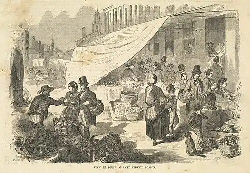 Markets have operated in this part of Boston since the 1600s.[19] The first market buildings were constructed in 1734.[17]: 7 The indoor market at Faneuil Hall opened in 1742. Open-air markets have been in continuous existence in the vicinity since early in the 19th century,[20][21][22][23] with many transformations over the years.[24] The Haymarket Pushcart Association traces its roots to 1820.[1]
