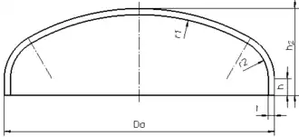 These heads have a dish with a fixed radius (r1), the size of which depends on the type of torispherical head.[3] The transition between the cylinder and the dish is called the knuckle. The knuckle has a toroidal shape. The most common types of torispherical heads are: