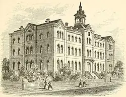 The practice of holding annual dinners ceased, but the Hebrew Benevolent Society did establish an orphanage, which opened in a rented three story brickhouse on Lamartine Place (now West 29th Street) in Chelsea in 1860 with several dozen boys and girls.[3] On each holiday the children were taken to a different synagogue, to placate the different brands of Judaism of the sponsoring organizations.[3] During the Draft Riots, the mobs came to the very street where the orphanage was, but did not attack it,[4] unlike the Colored Children's Orphan Asylum. In November 1863 the orphanage moved to a purpose-built home on East 77th Street near Third Avenue.[5] In the orphanage, girls were taught domestic skills, while the boys were taught shoemaking and printing; the orphanage's printshop produced a magazine, Young Israel, to which Horatio Alger supplied a serial novel.[6] In 1874 the organization renamed itself the "Hebrew Benefit Society and Orphan Asylum," and agreed to accept $110 a year in public funds to care for each orphan.[7]