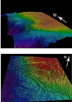 To the east, Heceta Bank is bound by a steep and smooth continental shelf.[1] In contrast, the bank's topography is relatively complex and irregular. In shallow depths (<100 m), the bank is composed primarily of rock and boulder outcrops, which are separated by small valley-like features. These valleys are presumed to have been created from the erosion of waves during historical periods when sea level was much lower than it is currently.[5] At greater depths, the seafloor transitions to smaller cobbles and fine-grain sediment, such as mud and silt.[2][5] This complex seafloor provides important habitat for many benthic-dwelling species, such as rockfish and other demersal species.[5] Furthermore, the irregularity in topography, caused by movement due to crustal uplift and transform faults, also allows for the release of methane gas from the sediment, which occurs from <100 to 600 m depth.[6]