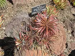 No 'Burgundy' plants had ever bloomed in cultivation, until a specimen grown at the California Botanic Garden (formerly the Rancho Santa Ana Botanic Garden, or RSABG) finally bloomed in March of 1994. The inflorescence was evidently not that of Hechtia montana, the only known Hechtia on the Baja California Peninsula, and so the undescribed species was named in 1995 as Hechtia gayii by Lee W. Lenz, after Ed and Betty Gay.[3]