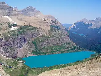 Helen Lake is located in Glacier National Park, in the U.S. state of Montana. Helen Lake is at the head of the Belly River and is situated below Ahern Peak to the west and Ipasha Peak to the northwest.[2] Numerous small streams feed the lake in addition to melt waters from the Ahern Glacier which descend 1,680 feet (510 m) over Ahern Glacier Falls in one sheer drop to a talus slope below en route to the lake.[3]