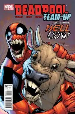 Hellcow later appears in Spider-Man/Deadpool, having assumed an anthropomorphic form and joined Deadpool Inc., a group assembled by Deadpool to steal and sell abandoned S.H.I.E.L.D. technology.[8]