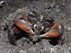 The claws are sexually dimorphic, with males' claws showing positive allometry, while females' claws grow isometrically; a male's claws thus become proportionally larger as the crab grows, becoming much larger than those of females.[3] The colour of the claws is correlated with both sex and size. The smallest crabs have green claws, followed by orange and pink, with the largest male crabs having purple claws; females with purple claws have small claws.[3] The purple colour is the easiest of the four to distinguish against the reflectance spectrum of the mudflats on which the crabs live.[3]