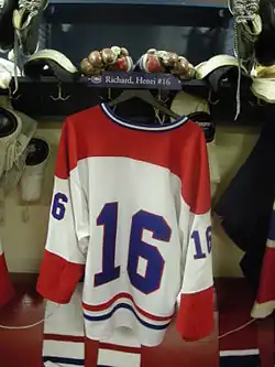 A few months after he announced his retirement, the Canadiens retired his jersey, number 16, at a pre-game ceremony on December 10, 1975.[25] As well, the team also honoured the person that wore it before him, his former Junior A coach, Elmer Lach.[25] He was elected to the Hockey Hall of Fame in 1979.[1] In 1998, he was ranked number 29 on The Hockey News list of the 100 Greatest Hockey Players.[26] He later served as an ambassador for the Canadiens' organization.[9] In 2017, as part of the NHL's centennial celebrations, the league compiled a list of the 100 greatest players during the past century, with Richard on it.[27]