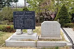 In June 1902, at the age of 44, Appenzeller was traveling to a southern port city, Mokpo, to attend a meeting for the Bible translation. He sailed aboard the Kumagawa Maru, a steamship which collided suddenly at night with another vessel. The loss of life on the Kumagawa Maru was 27 in all. A survivor, one Mr Bowlby, describes the speed of the sinking followed by the boiler bursting. Appenzeller is thought to have fatally delayed his escape from the vessel by trying to wake a Korean woman and her child so as to get them out of their cabin.[12] A cenotaph in his honor was erected at the Yanghwajin Foreigners' Cemetery, the gravesite of over 300 foreigners including over 80 missionaries from many denominations including those sent by the United Methodist Church, and its predecessor denominations in the late 19th and early 20th centuries.