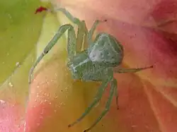 Heriaeus hirtus can reach a body length of 3.5–5.5 millimetres (0.14–0.22 in) in males, of 8–11 millimetres (0.31–0.43 in) in females.[6] These spiders are usually pale green, with a lighter green or pale yellow abdomen, vaguely triangular and longer than wide. The ventral side of the abdomen is green and has rows of black dots. Also legs are green. The body and legs are covered with long white bristles. The cephalothorax is divided longitudinally by a clear median line and usually shows three longitudinal and three transversal clear lines. Males have a slimmer abdomen, usually with a reddish marking. Females are pale green, with long hairs and spines.[5][6] The external genital structure of female (Epigyne) is quite pale green, with an almost circular tongue.[6] Three teeth are present on the anterior claws. This species is quite similar to Heriaeus melloteei and to Heriaeus graminicola.[5]