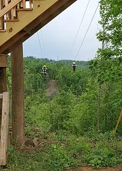 | RedTail Racers Dual Zipline | Dual 1100-foot long ziplines traveling over and back across the valley that houses Heritage Farm at 40 miles per hour. While over the valley, guests are 130 feet high. | -Weight requirement: between 75-250 pounds -Closed toe shoes and shorts/pants must be worn | ![]() ![]() ![]() |